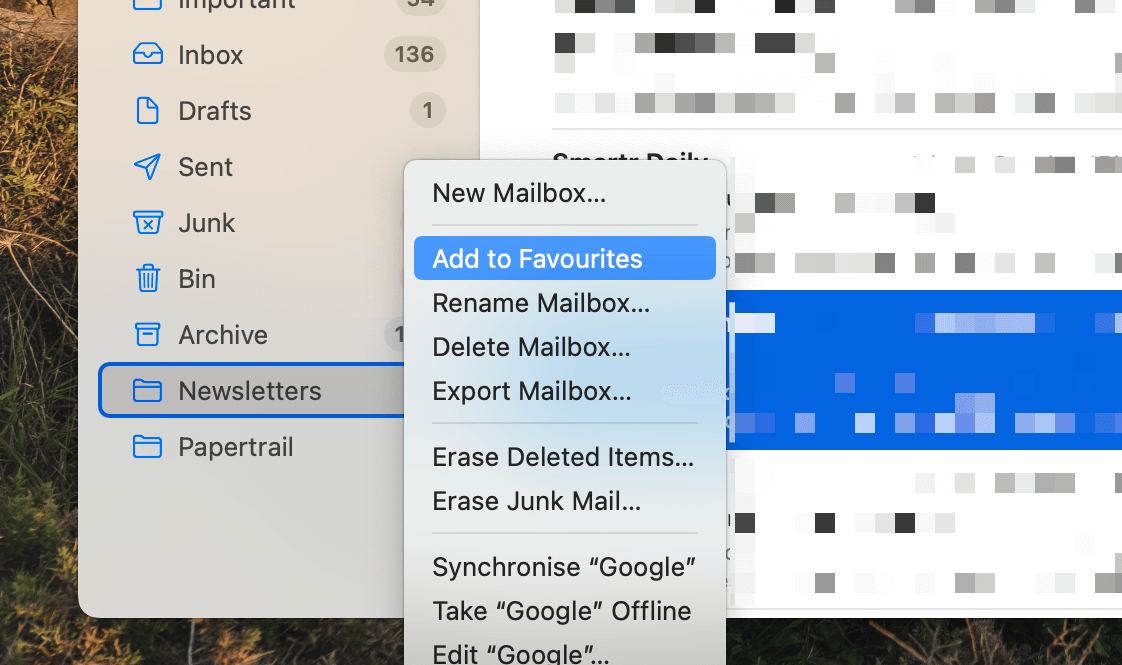 If you use labels to tag incoming emails, add your frequently used ones to Favourites in the Mailboxes sidebar by right-clicking a label and choosing Add to Favourites: