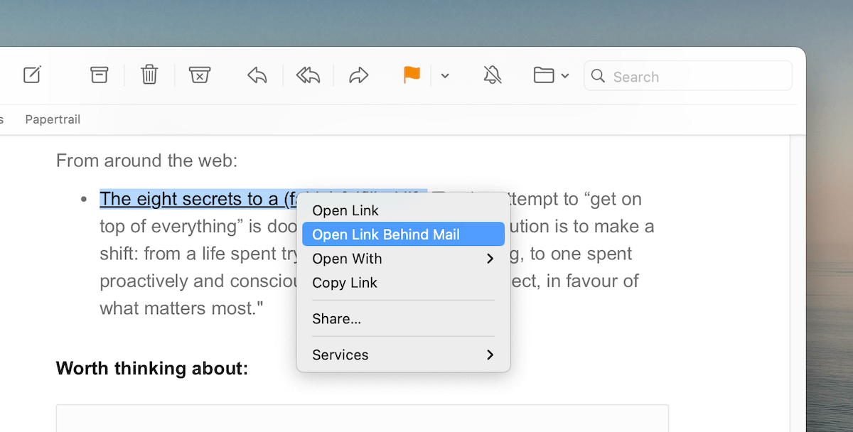 You can open links from emails in your default browser without disrupting your flow by right-clicking on a link and choosing Open Link Behind Mail: