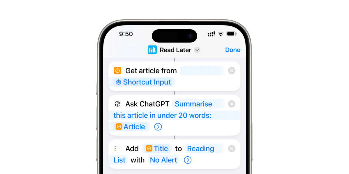 Tapping this Read Later option gets the article's content, passes it through ChatGPT to get a 2-liner summary, and saves it in my reading list in the Reminders app. The 2-liner summary gets added to the Notes field of the new task.