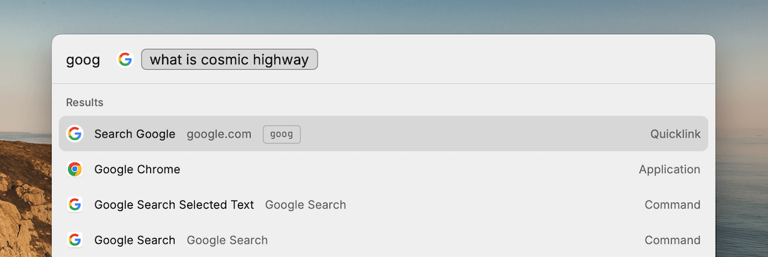 Then, instead of doing a Google search from your browser, you can use Raycast, which will take you directly to that clean Web search view: