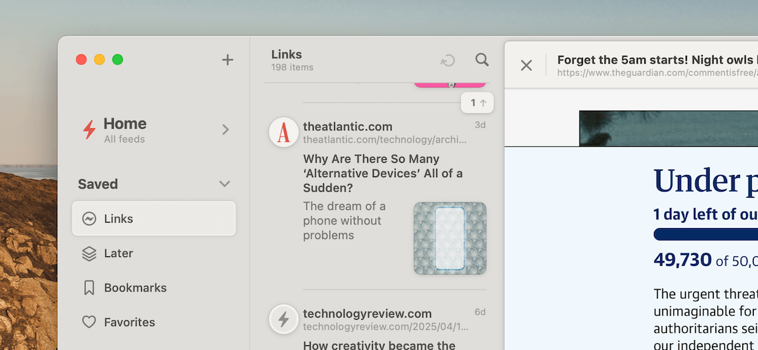 Since late last year, I've been using the new Reeder app as my all-in-one place to read articles from subscribed RSS feeds and also the ones I save from around the Web: