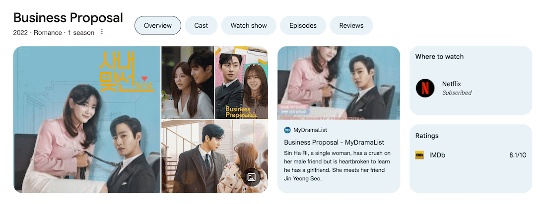 While Ecosia does have a knowledge card, it's nowhere near what Google shows. But that hasn't been a blocker, because I could navigate to the IMDb or Goodreads link from the search results and find what I was looking for.
