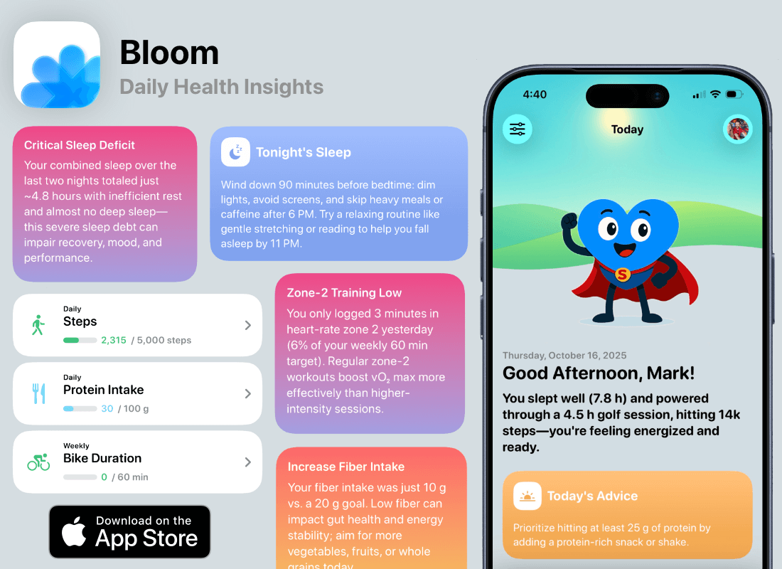 I’m Bud—the coach inside Bloom. I sort through your Apple Health data, find what actually matters, and give you clear tips every day.
