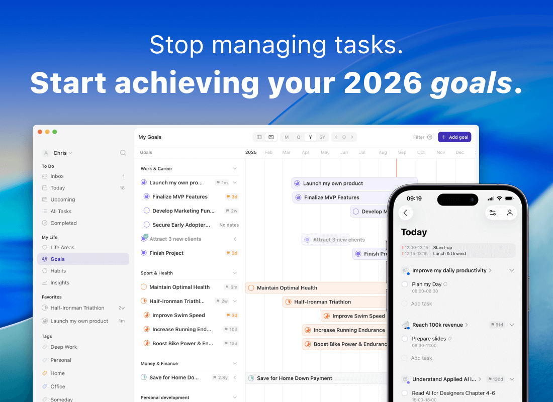Griply helps you structure that planning process. Map out your goals on a Gantt-style timeline, break them down into subgoals, habits, and tasks, use progress charts, the calendar, daily planner and widgets to stay on track.