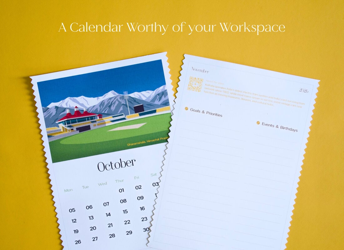 Designed for 2026, this desk calendar works like a monthly planner and looks like a postcard, featuring hand-illustrated Indian landmarks on premium linen paper.