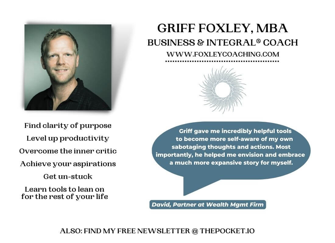 I’m Griff, and my Integral® Coaching can support you to discover your purpose, overcome your inner critic, and gain alignment in your work & life.